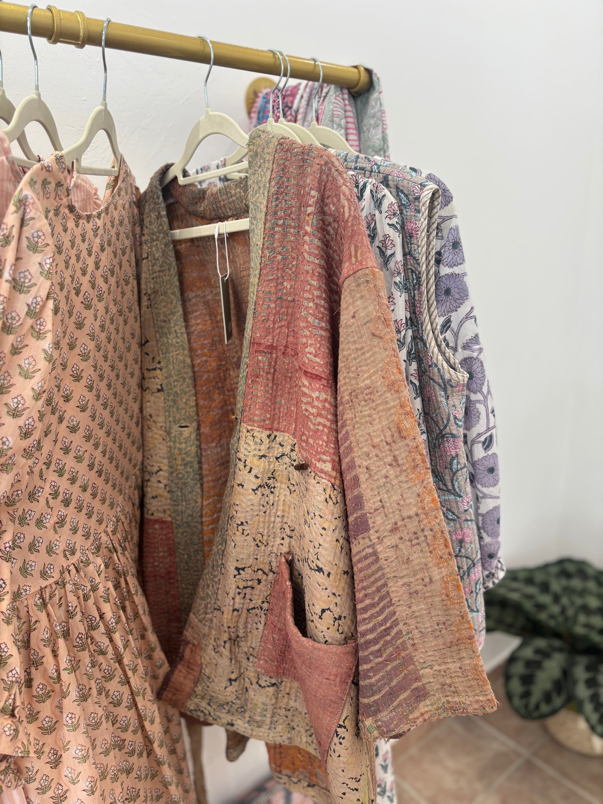 Chaqueta india de tela gruesa tipo kantha, súper cómoda y con colores suaves que combinan con todo. Trae cinto para ajustarla a la cintura y darle tu propio estilo. Ideal para esos días fresquitos en los que querés estar abrigada pero con onda.