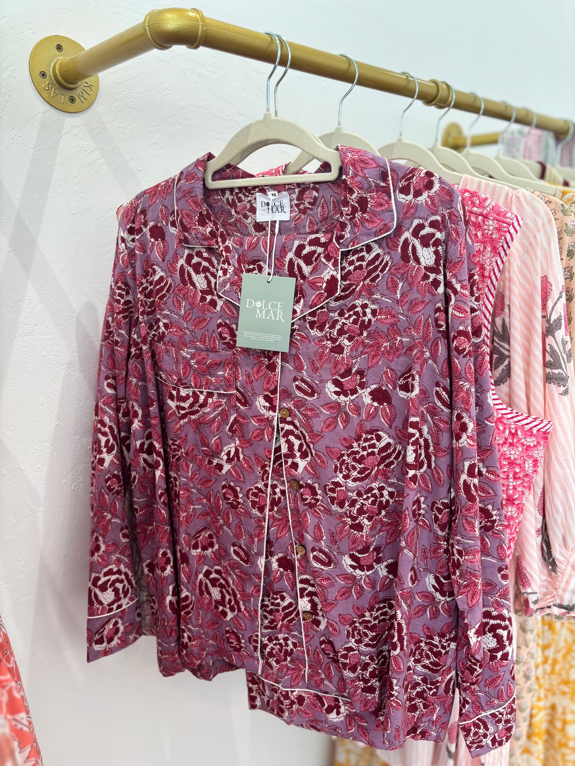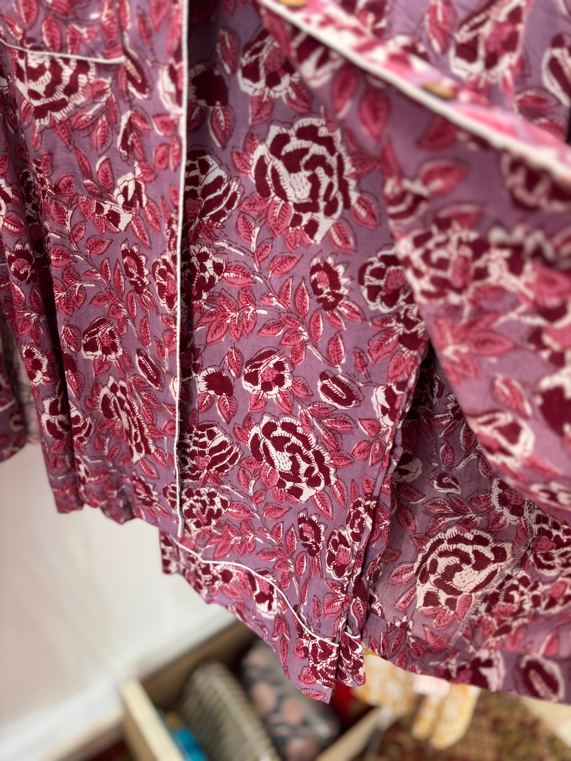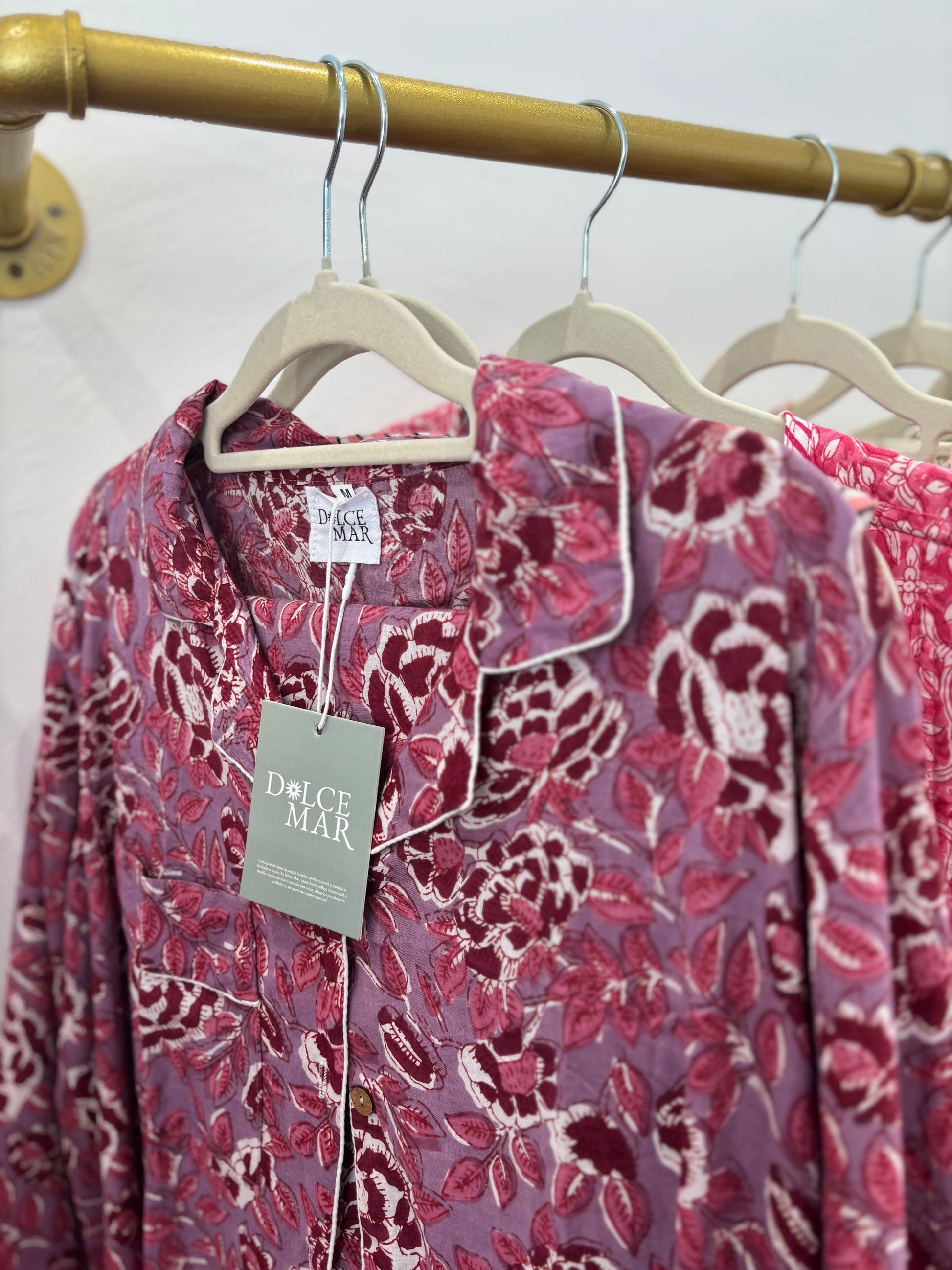 Nuestros pijamas Block Print son 100% algodón, artesanales y con estampados únicos hechos a mano con bloques de madera. Son suaves, frescos y cómodos, ideales para dormir o estar en casa. Cada detalle está cuidado para que tu descanso sea relajado y lindo.