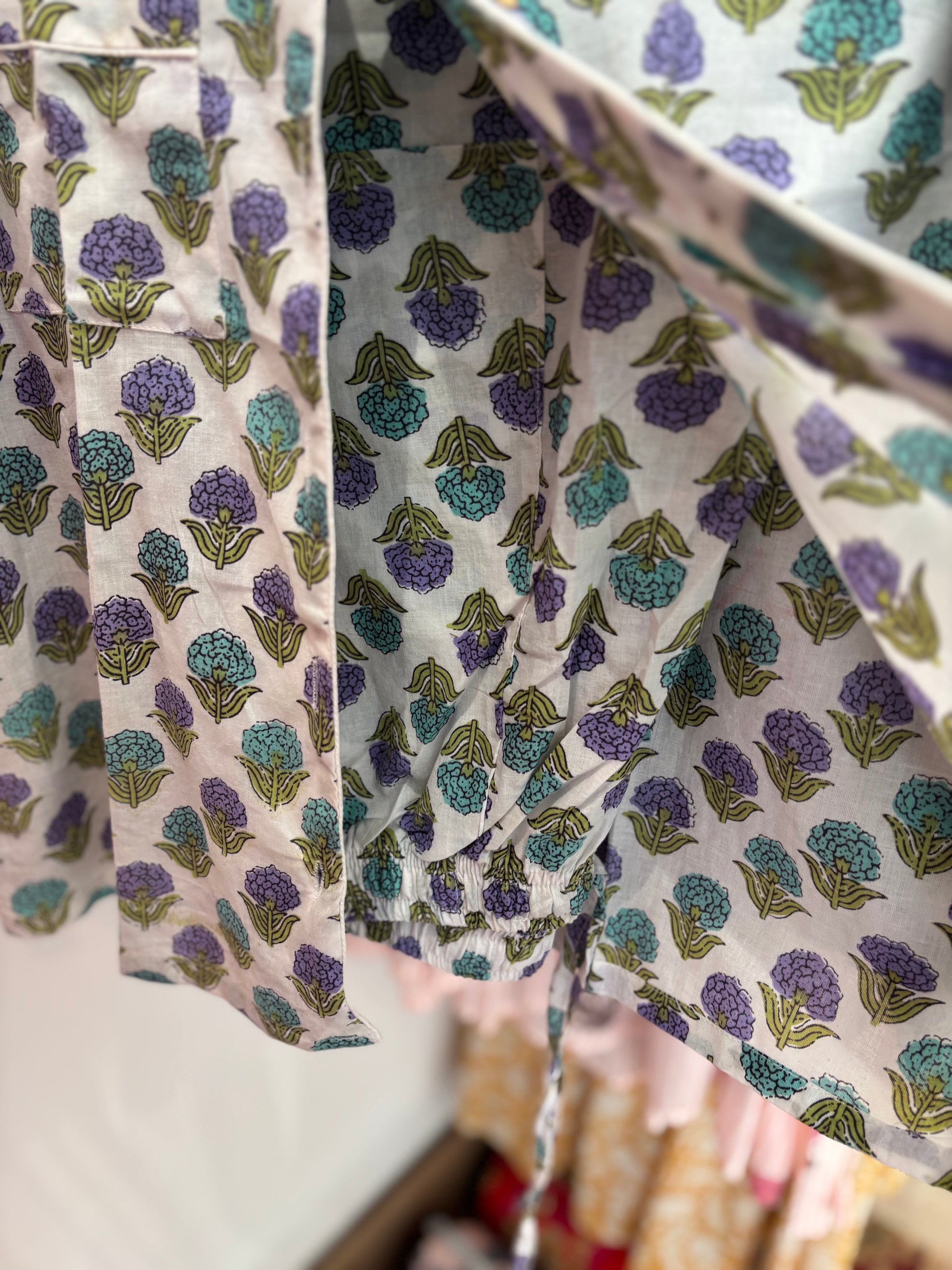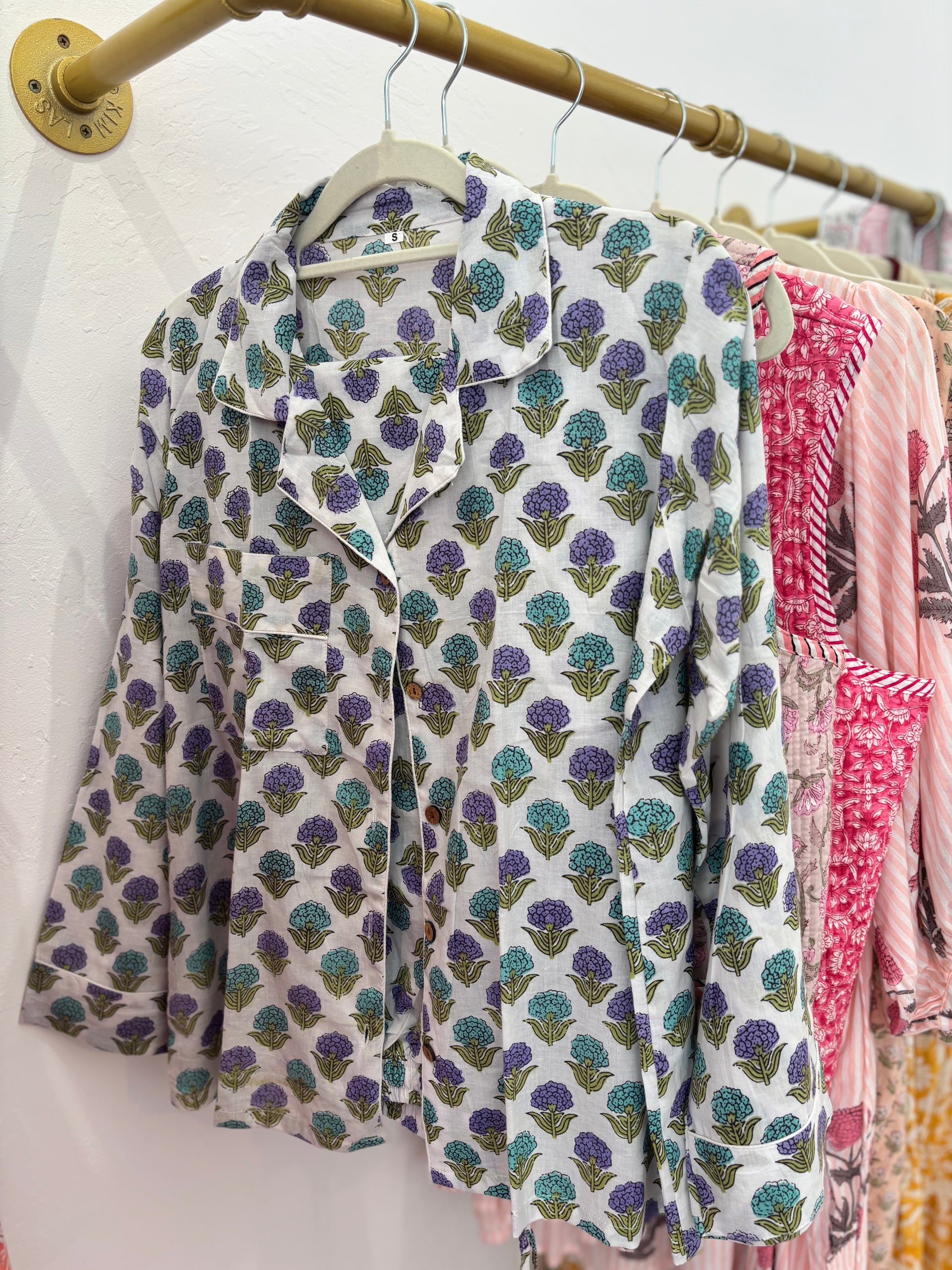 Nuestros pijamas Block Print son 100% algodón, artesanales y con estampados únicos hechos a mano con bloques de madera. Son suaves, frescos y cómodos, ideales para dormir o estar en casa. Cada detalle está cuidado para que tu descanso sea relajado y lindo.