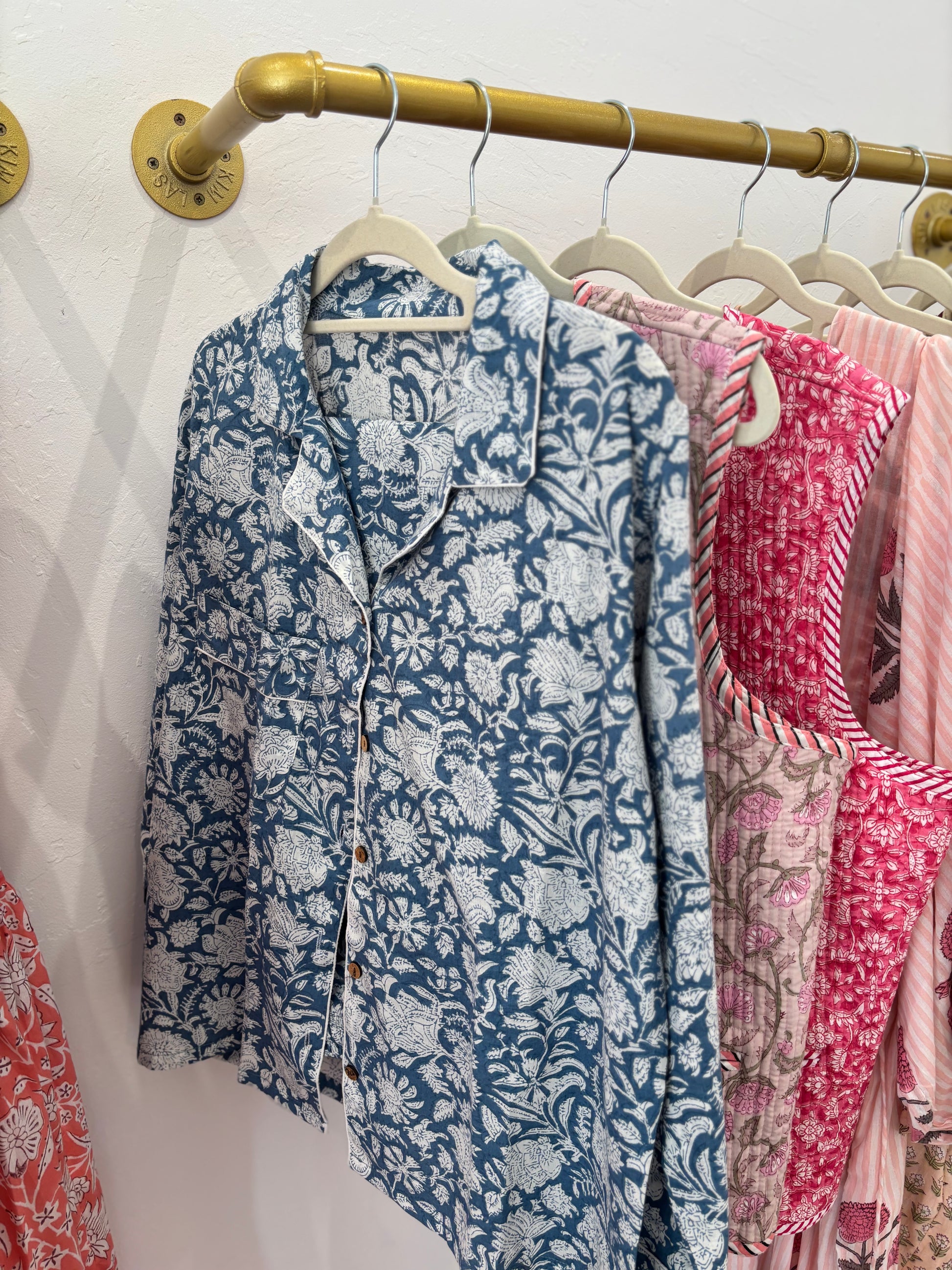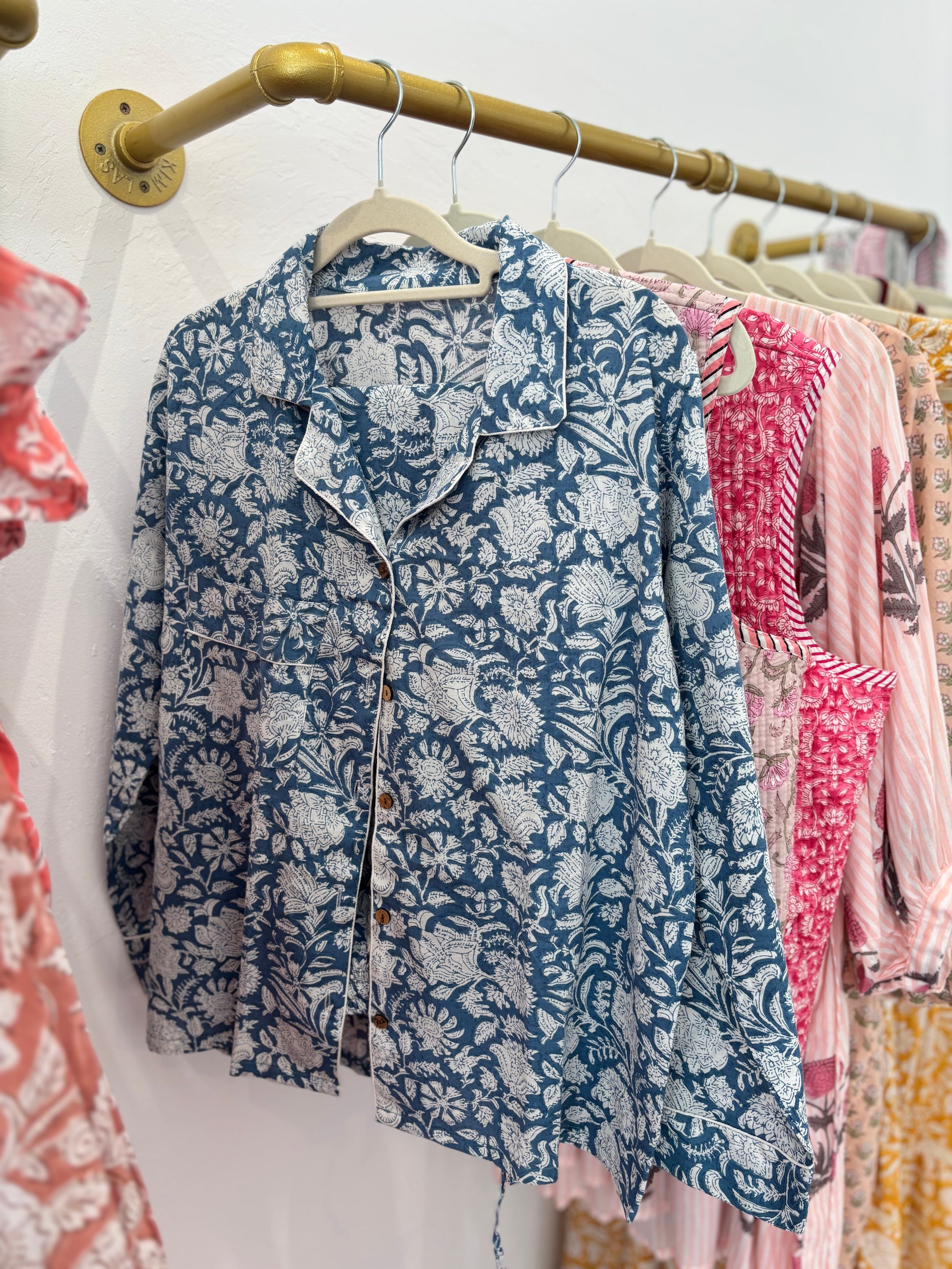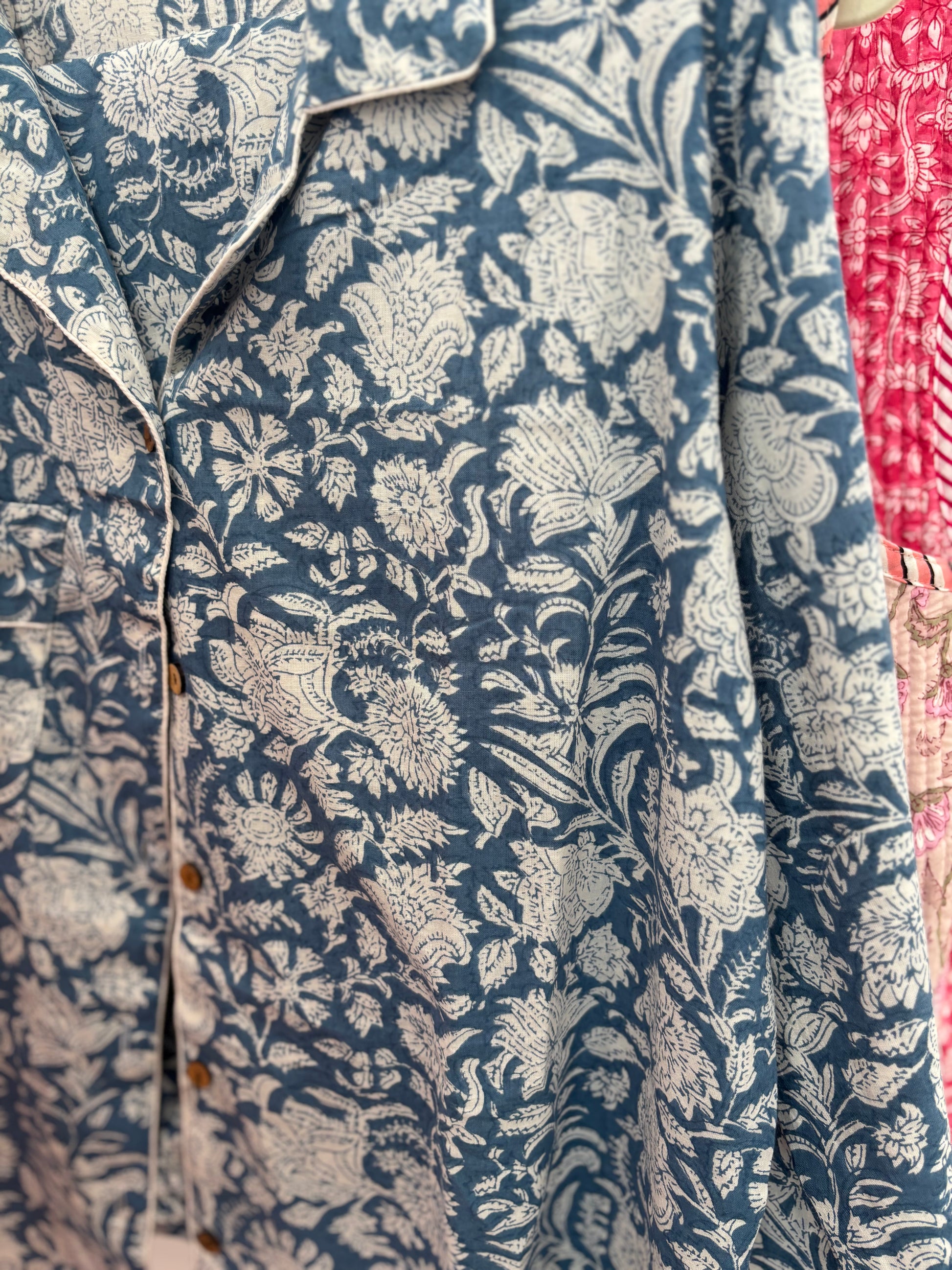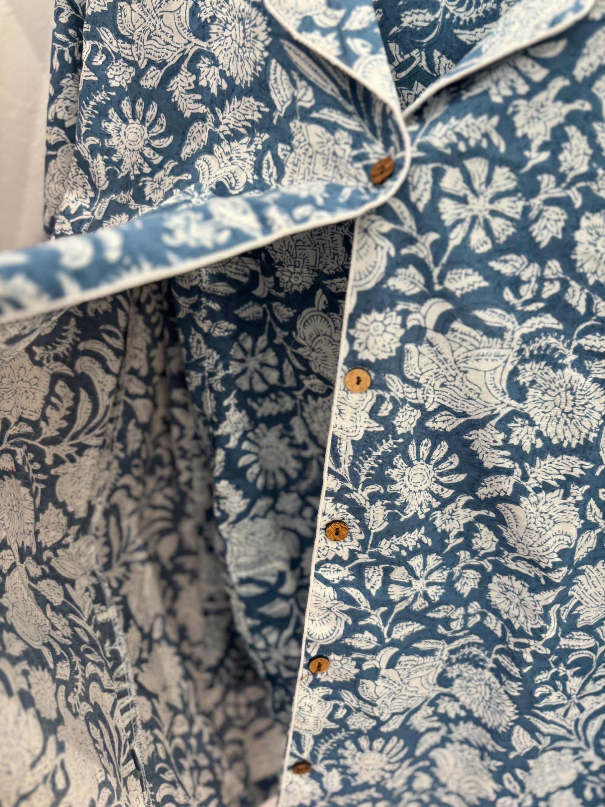 Nuestros pijamas Block Print son 100% algodón, artesanales y con estampados únicos hechos a mano con bloques de madera. Son suaves, frescos y cómodos, ideales para dormir o estar en casa. Cada detalle está cuidado para que tu descanso sea relajado y lindo.