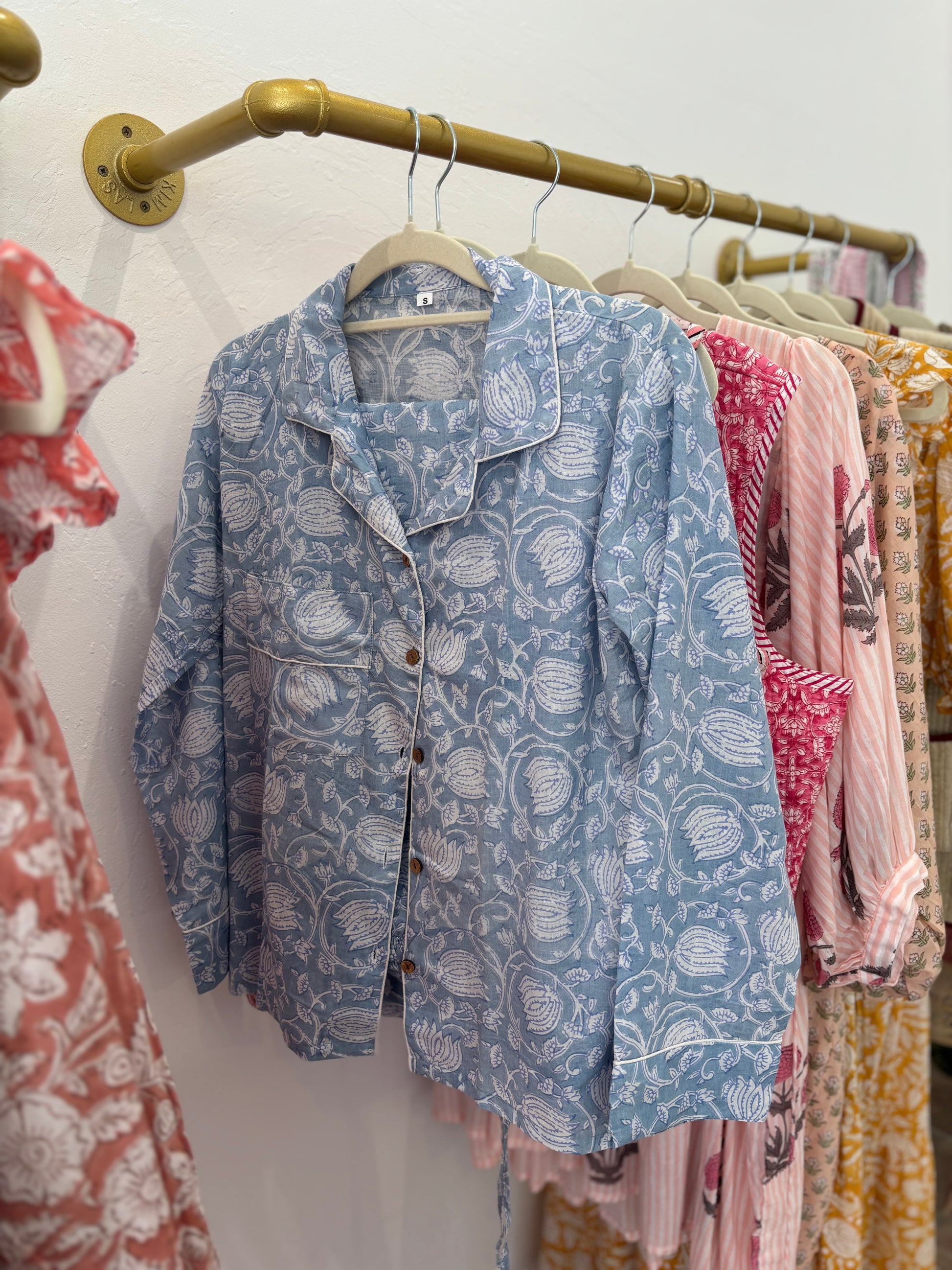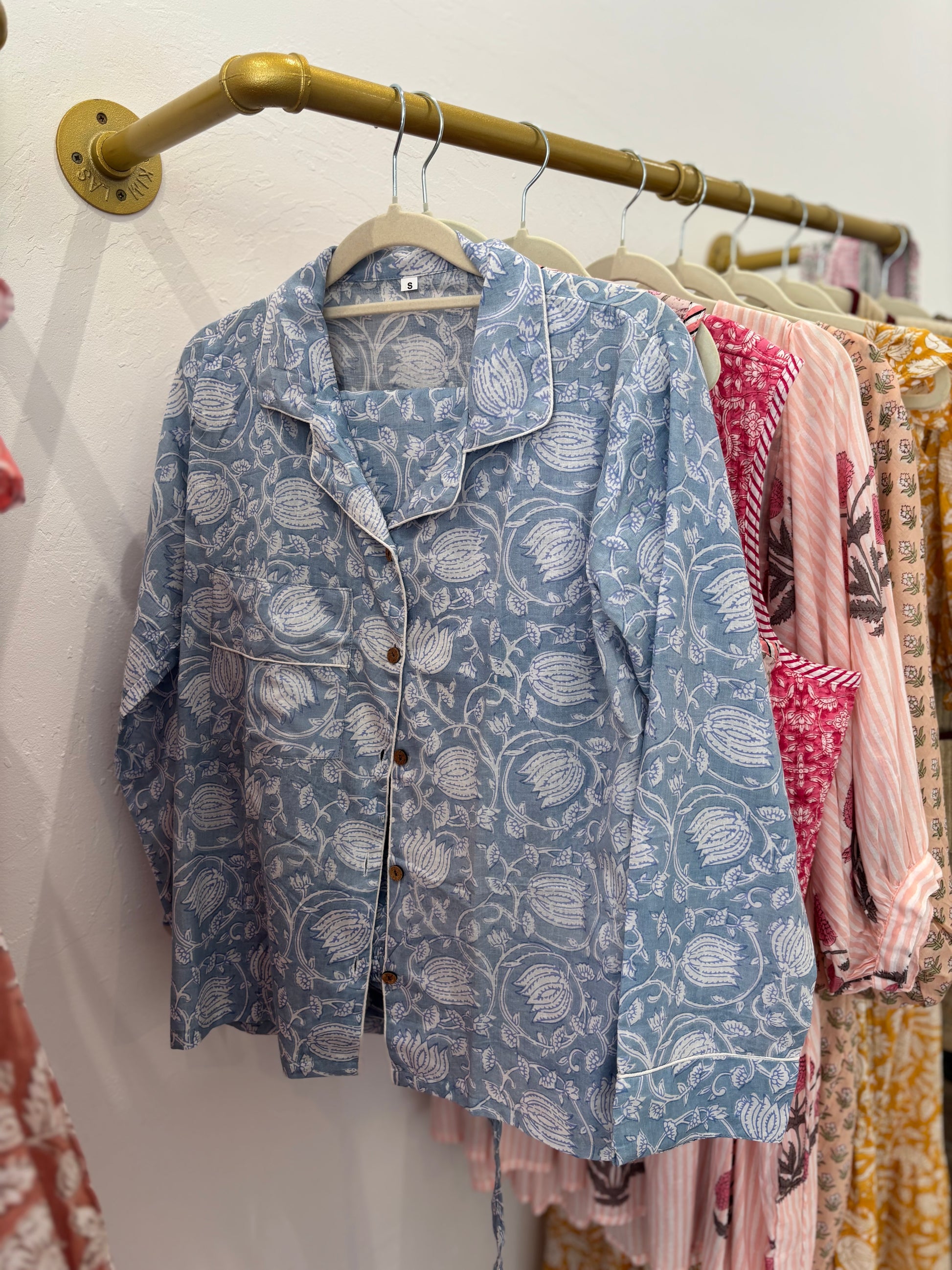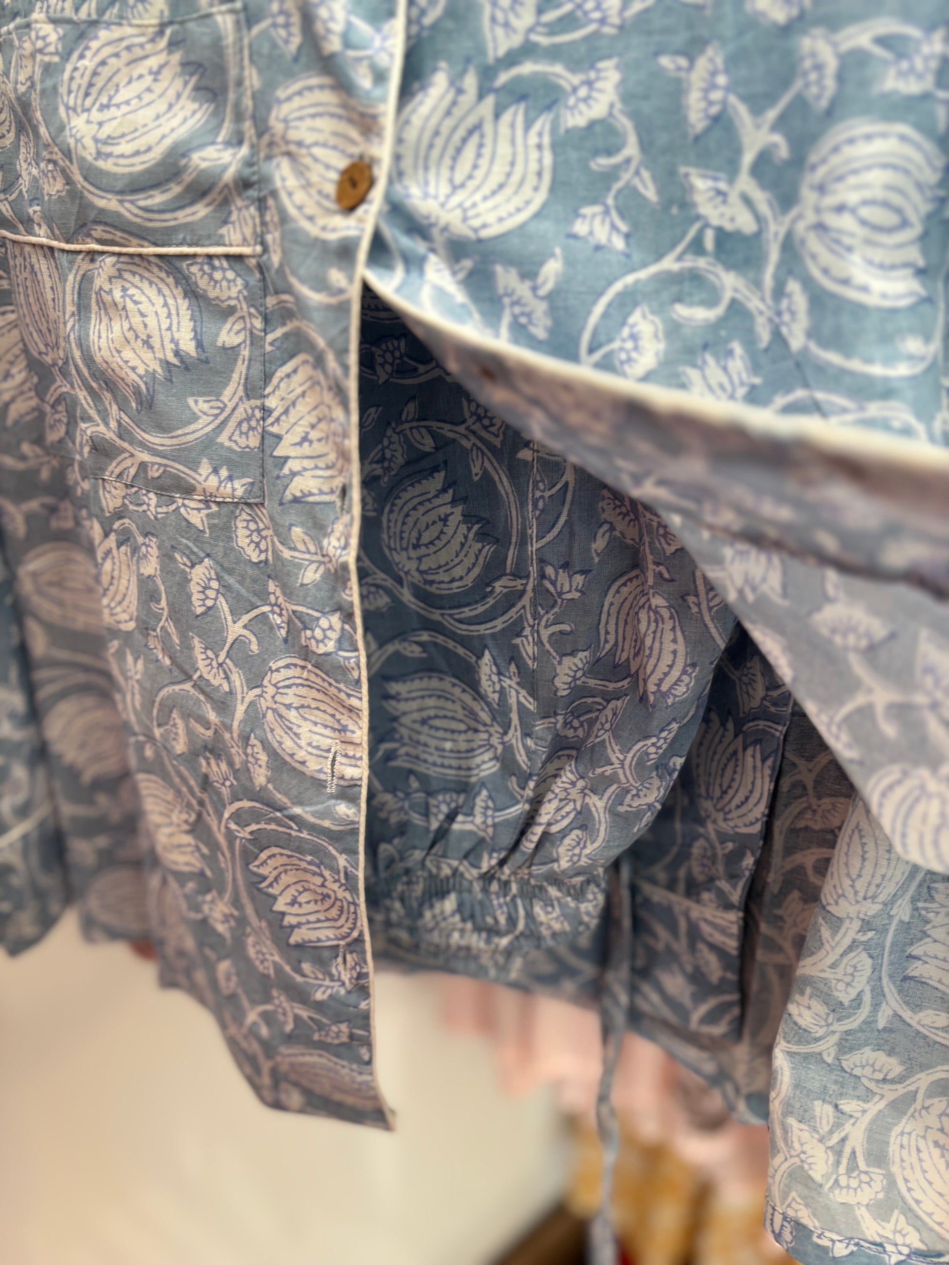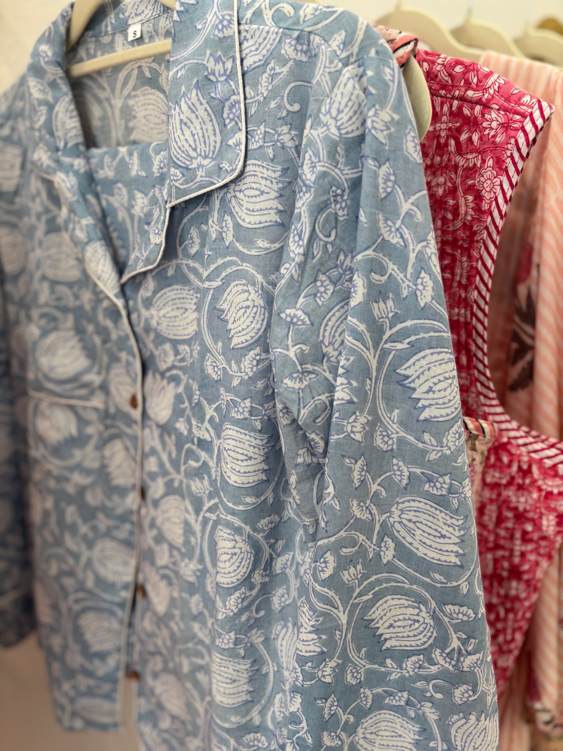 Nuestros pijamas Block Print son 100% algodón, artesanales y con estampados únicos hechos a mano con bloques de madera. Son suaves, frescos y cómodos, ideales para dormir o estar en casa. Cada detalle está cuidado para que tu descanso sea relajado y lindo.